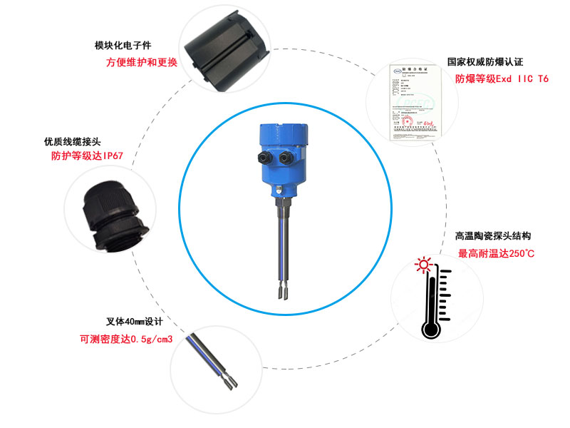 UVVE音叉液位開關利用音叉原理設計,壓電器件使音叉以固有頻率諧振。當音叉與被測液體接觸時,叉體的諧振頻率出現變化,電子部件檢測到這一變化并輸出一個開關信號。 |