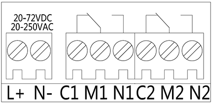 L+ N-:電源輸入端電源輸入端+8/16mA電流信號輸出端 C1 M1 N1/C2 M2 N2:繼電器輸出DPDT |